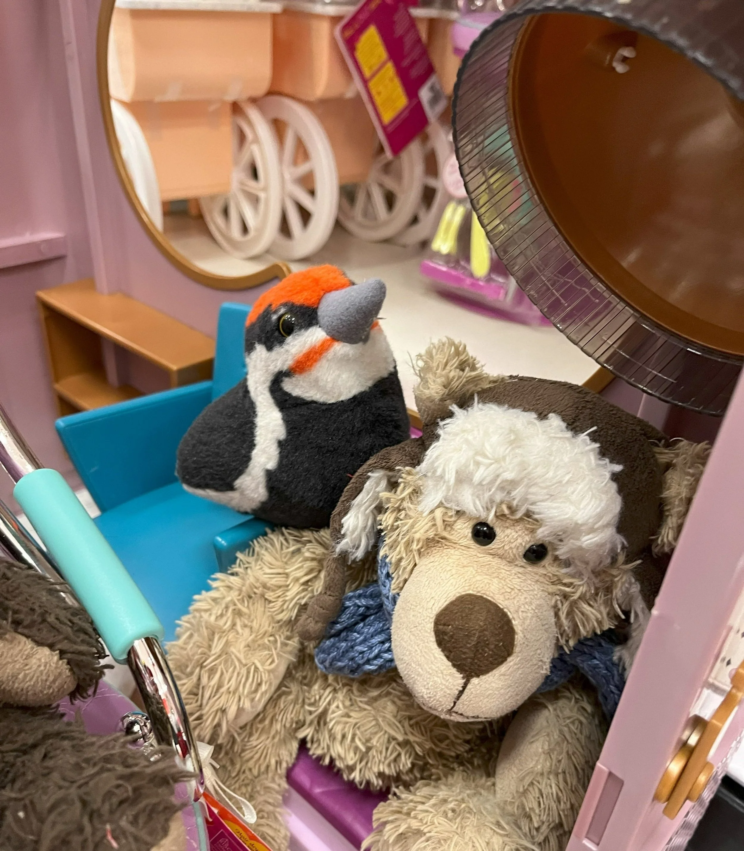 Flicker is especially good at operating the hair dryer and permanent wave setter. Doesn’t S’mores look cozy in there?